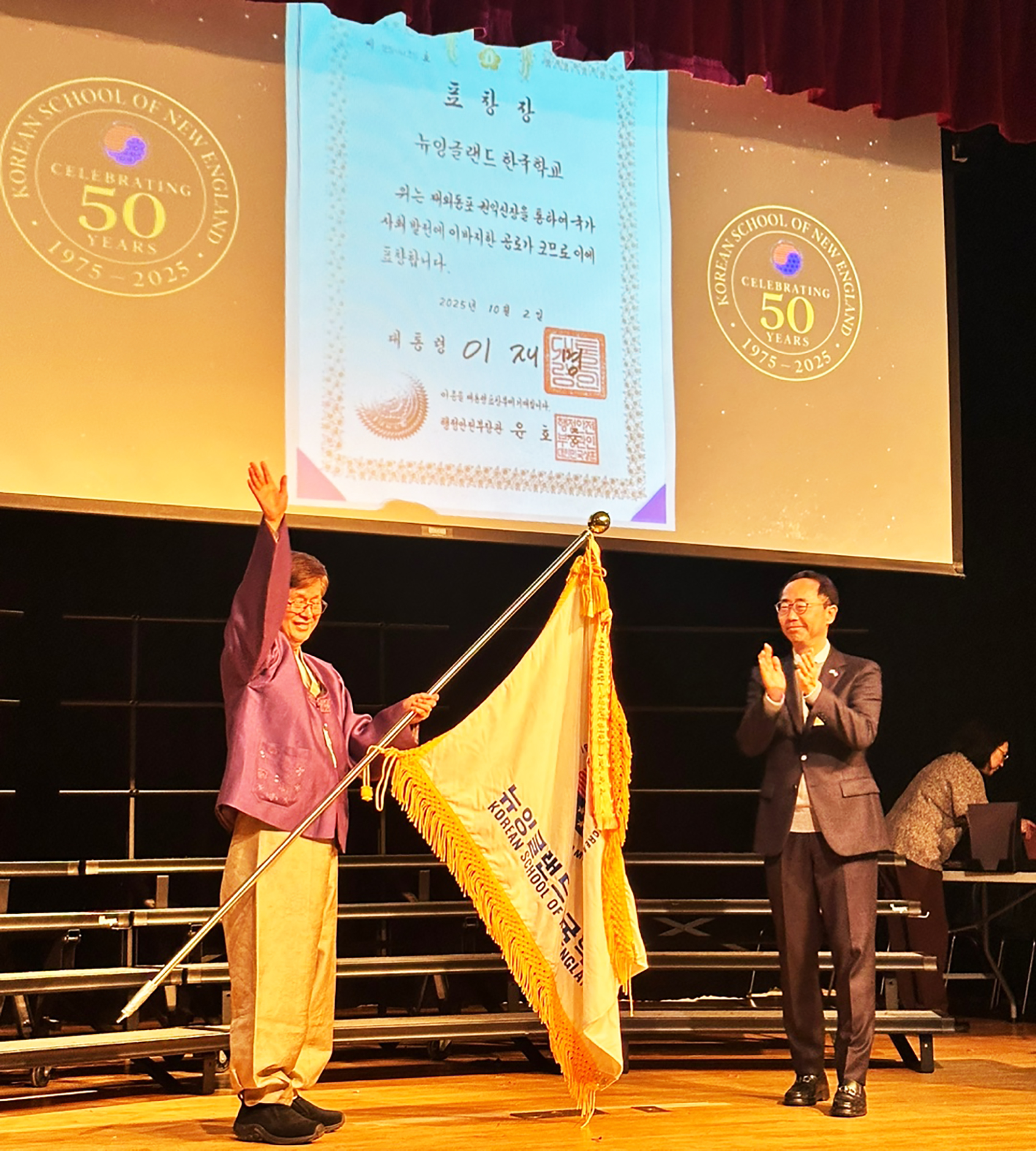 축사에 앞서 김재휘 총영사는 이어 남일 교장에서 대통령 표창장을 전수하고 뉴잉글랜드 한국학교 교기에 수치를 직접 달아 50주년의 의미를 더했다.