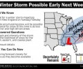 기상 전문가들은 화요일 새 폭풍 시스템이 접근한다고 분석했다. 이 노이스터의 경로가 내륙인 서쪽으로 지나 갈 경우 대서양의 비교적 따뜻한 공기가 유입돼 I-495 동쪽 지역은 대부분 비가 내릴 가능성이 높다. 그러나 폭풍이 조금 더 해안에서 동쪽으로 떨어져 지나가면 비-눈 경계선이 해안 가까이 이동하면서 보스톤도 시즌 첫 적설을 기록할 수 있다.