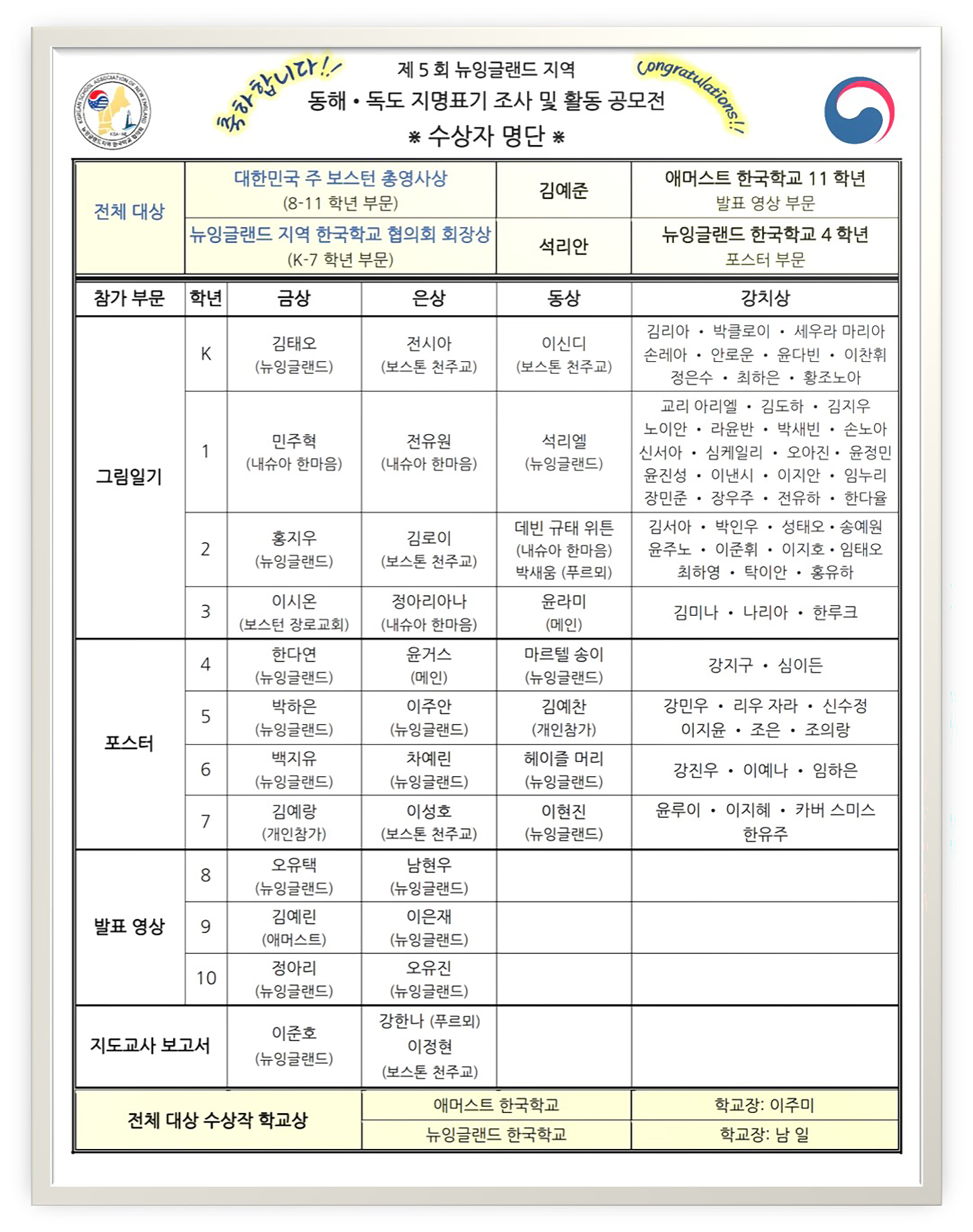 뉴잉글랜드지역 한국학교협의회(회장 남일, 이사장 오인식)는 지난 12월 6일 제5회 동해·독도 지명표기 조사활동 시정 공모전 시상식을 열고 참가한 학..