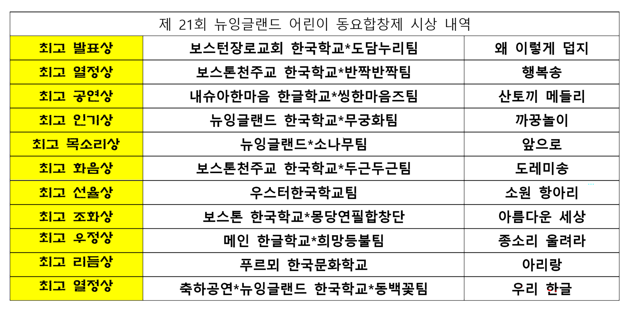 (보스톤=보스톤코리아) 편집부 = 뉴잉글랜드지역 한국학교협회(회장 남일, 이사장 오인식)가 12월 첫 주말인 6일 제21회 뉴잉글랜드지역 어린이 동요합창제를 개최했다. 이번 합창제는 뉴잉글랜드 한국학교 강당에서 열렸으며, 뉴햄프셔, 메인, 버몬트 등 NE 지역 4개 주에서 모인 11개 팀 학생들과 학부모, 교사들이 함께해 따뜻한 동요 축제를 만들었다. 행사에는 내슈아 한마음 한글학교(교장 박노환), 뉴잉글랜드 한국학교(교장 남일), 보스턴장로교회 한국학교(교장 장성철), 보스톤 한국학교(교장 강상철), 우스터 한국학교(교장 윤미랑), 보스톤 천주교 한국학교(교장 서용학), 메인 한글학교(교장 안영례), 푸르뫼 한국문화학교(교장 신영주) 등 한국학교가 참가했다. 이정설 총무의 사회로 진행된 이번 행사에서 남일 회장과 곽정렬 부총영사는 “어릴 적 즐겨 부르던 동요가 떠오른다”며 “20여 년 긴 세월 동안 2세들이 참가하는 이처럼 아름답고 멋진 행사를 준비하고 개최해 온 협의회 관계자 및 참가 학교의 학생, 학부모 및 지도해 주신 선생님 모두 즐겁고 행복한 마음 가득하시길 바란다.”고 축하의 메시지를 전했다. 각 학교는 도담누리팀(보스턴장로교회 한국학교), 소원항아리(우스터 한국학교), 반짝반짝·두근두근팀(보스톤 천주교 한국학교), 몽당연필팀(보스톤 한국학교), 동백꽃·무궁화·소나무팀(뉴잉글랜드 한국학교), 씽한마음즈팀(내슈아 한마음 한글학교) 등 개성 넘치는 팀을 꾸려 무대에 올랐다. 이 팀들은 열심히 연습한 새로운 노래를 발표해 박수갈채를 받았다. 우스터 한국학교 합창단-소원항아리 내슈아한마음 한글학교-씽한마음즈팀![]() 뉴잉글랜드 지역 한국학교협의회 주최로 개최되는 동요합창제는 5개주에 위치한 각 학교들이 희망과 사랑의 메시지를 나누는 축제를 통해 서로를 격려하고 축하하기 위해 개최하고 있다. ‘ 행사 영상은 유튜브(https://www.youtube.com/watch?v=rUQ2NBy0HBc)를 통해 시청할 수 있다. 제21회 동요합창제 시상 내역도 현장에서 발표됐으며, 협의회는 내년 1월 예정된 교장단·회장단 온라인 연석회의에서 2026년 주요 사업을 논의할 계획이다. 이어 3월 27일에는 ‘2026년도 교사 사은회 및 정기연수회’가 열린다. 뉴잉글랜드지역 한국학교협의회 참가 문의는 전화 (508) 523-5389로 하면 된다. |