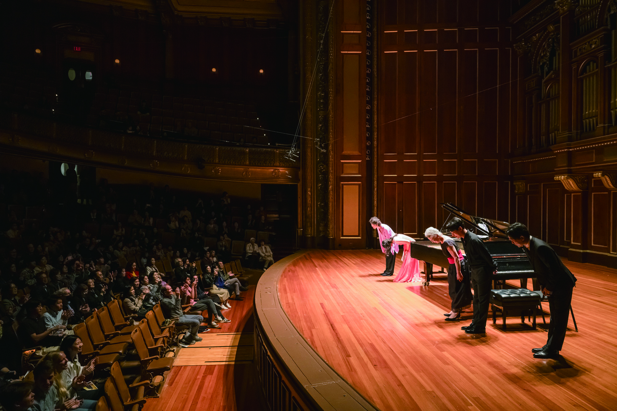 계속 이어지는 박수 속에 모든 연주자들이 무대에 나와 인사하고 앙코르 곡으로 드보르작의 <슬라빅 댄스, Op. 72-2>와 라흐마니노프의 <식스 핸즈를 위한 로망스>를 연주해 주었다. 드보르작은 김정자 교수를 제외한 네 명이 한 피아노에 두 명씩 앉아 연주했고, 라흐마니노프는 김교수가 합류하여 한 피아노에는 세 명이, 또 다른 피아노에는 두 명이 앉아서 연주했다. 피아노 의자를 이리저리 붙여 앉을 자리를 만드는 모습에 객석에서는 웃음이 터졌다.